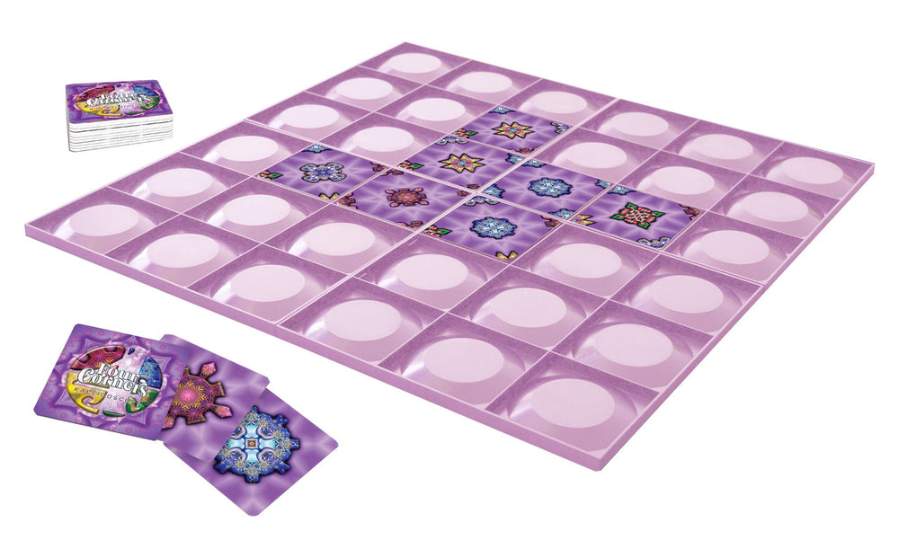 Four Corners: Kaleidoscope is a living puzzle! In this quick, fun, and captivating game, everyone has a different solution, but only the player who best manipulates the board and completes their puzzle will win! Players each start a game of Four Corners: Kaleidoscope game with secret goals. Every turn, you'll add, twist, rotate, and flip tiles to reach your goal. This is achieved on the unique, patented Four Corners game board, which allows tiles to rotate and move without affecting neighboring tiles. You score a goal either by creating sequences of four identical images, or by completing a full image from the corners of four tiles. Watch out, because other players will also be shifting and changing the board to shape it the way they need. The first player to achieve three of their secret goals wins!