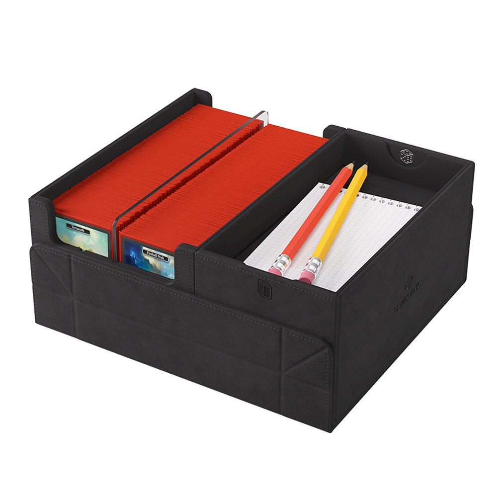 The Games‘ Lair 600+ can hold 600 double-sleeved or 800 single-sleeve cards in the main compartment. If card storage is not the purpose, the acrylic divider can be removed to store any kind of deck boxes, games, or accessories.