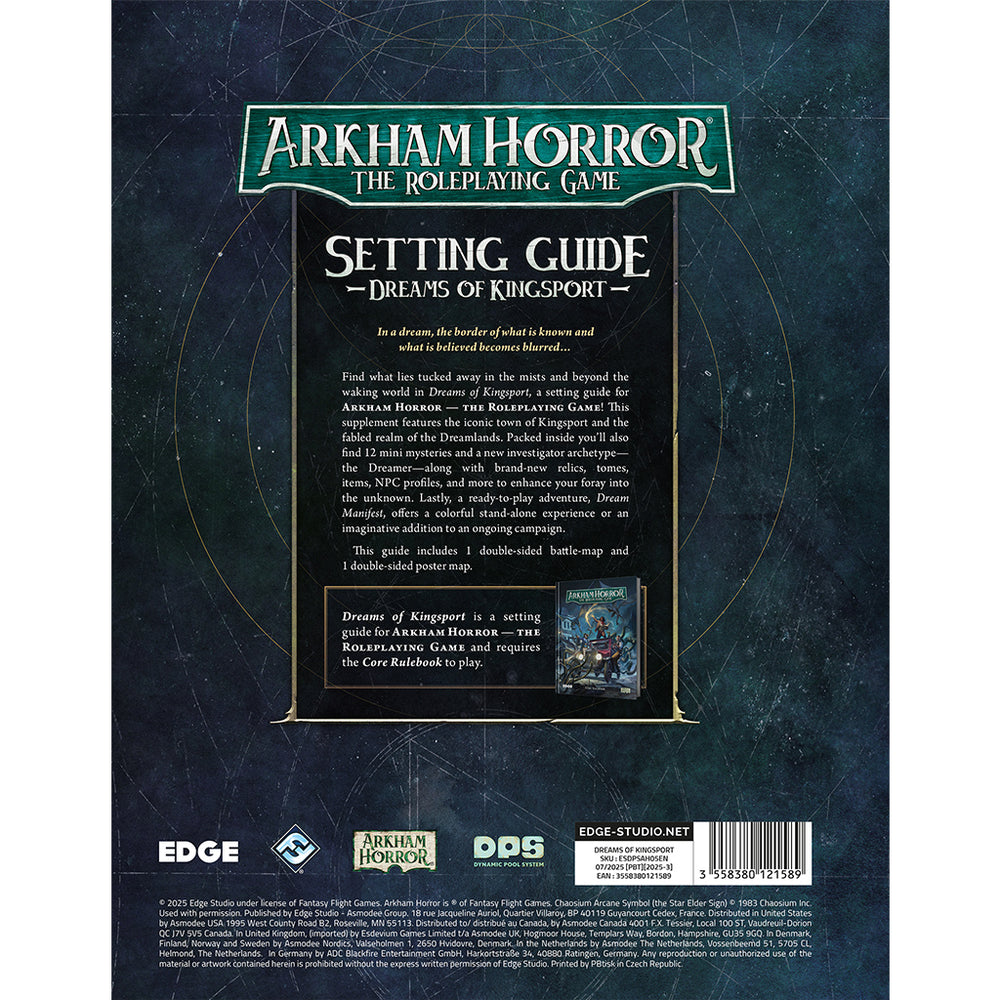 Arkham Horror RPG - Dreams of Kingsport is an expansive setting guide that takes your campaigns beyond the waking world. Dive into the iconic mist-shrouded town of Kingsport and unlock new rules for astral projection and creating gates to other worlds, allowing investigators to explore the fabled Dreamlands.