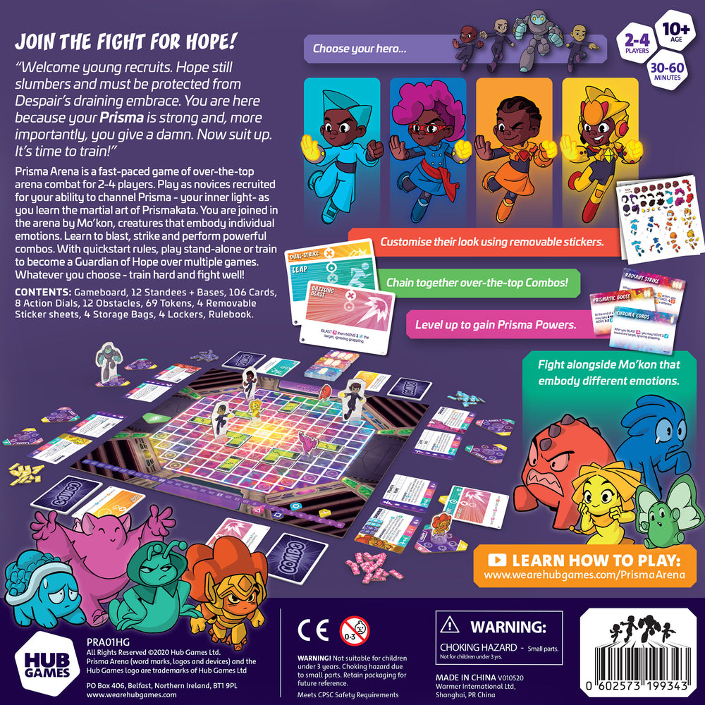 Prisma Arena is a fast-paced game of over-the-top arena combat for 2-4 players. Play as novices recruited for your ability to channel Prisma — your inner light — as you learn the martial art of Prismakata. You are joined in the arena by Mo'kon, creatures that embody individual emotions. Learn to blast, strike and perform powerful combos. With quick-start rules, you can play standalone or train to become a Guardian of Hope over multiple games. Whatever you choose, train hard and fight well!