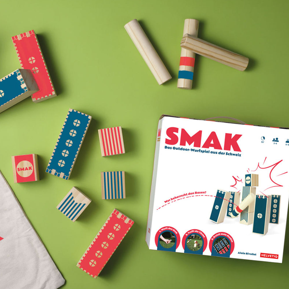 Just form teams, set up the towers, throw the batons to knock them down, cancel out your opponent‘s throws and score more points to win. SMAK is a game of skill that also requires tactical sense and a pinch of luck to win.