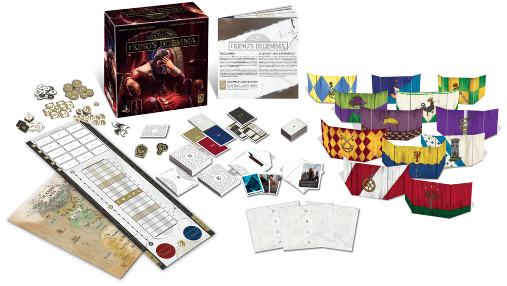 The King’s Dilemma™ is an interactive narrative experience with legacy elements, featuring several branching storylines leading to many possible finales and an evolving deck of event cards at its core.