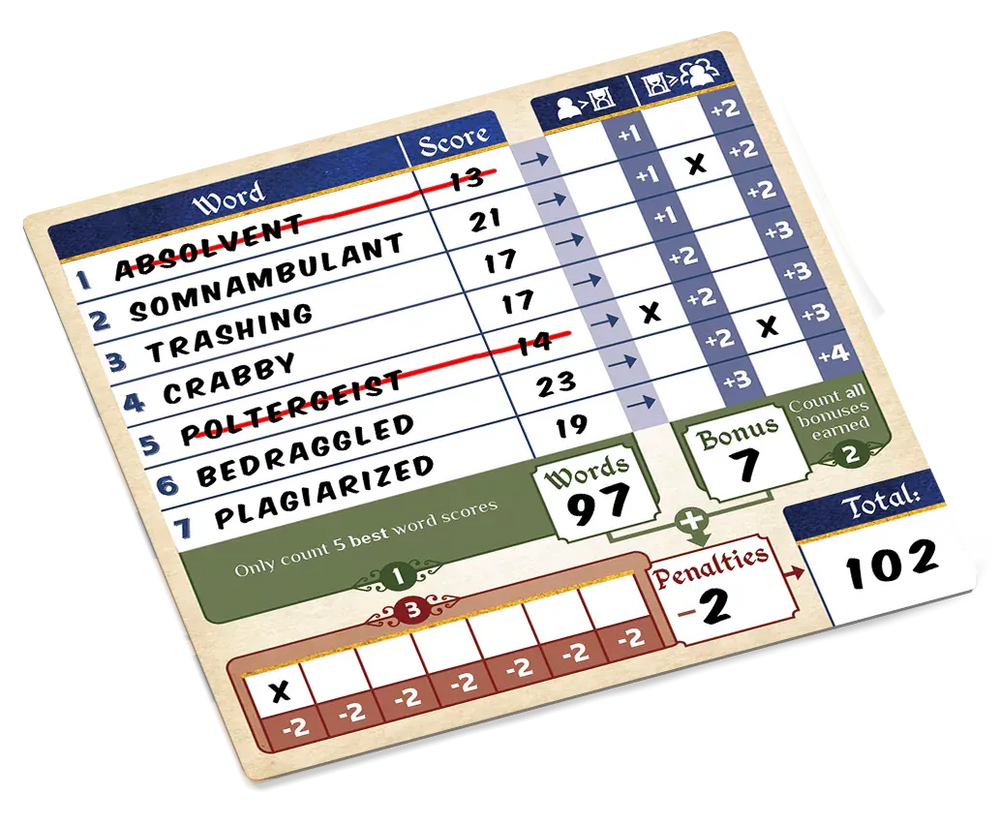 After 7 rounds, players add the scores their best 5 words, plus their bonuses. The player with the most points wins!